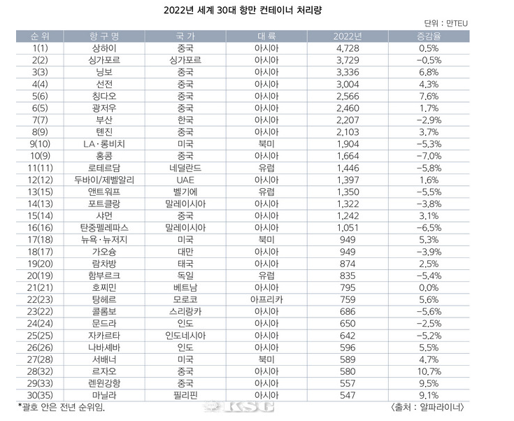 ?? ????? ??? 0.5% ??? 4728?TEU? ???? 13? ?? ?? 1? ???? ?? ??? ???. ?? ▲2? ????? 3729?TEU(-0.5%) ▲3? ?? ??? 3336?TEU(6.8%) ▲4? ?? ??? 3004?TEU(4.3%) ▲5? ?? ???? 2566?TEU(7.6%) ▲6? ?? ???? 2460?TEU(1.7%) ▲7? ?? ??? 2207?TEU(-2.9%) ▲8? ?? ??? 2103?TEU(3.7%) ▲9? ?? LA·???? 1904?TEU(-5.3%) ▲10? ?? ??? 1664?TEU(-7.0%) ????. 10? ??? ?? ????, ???, LA·???? ? ?? ? ?? ???? ?? ?????.